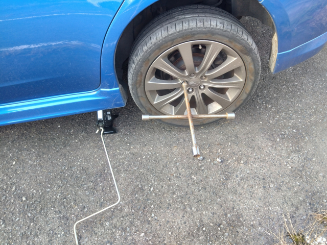 8/26朝 TAROを後閑駅まで送った帰り、上毛高原駅前で、左後輪に違和感