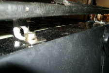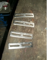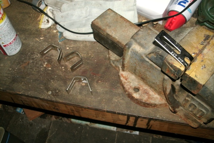 今度のステーは、2倍厚のステンの平板。万力とハンマーで、コの字に加工する。 これで、3倍保つ?(笑)