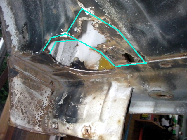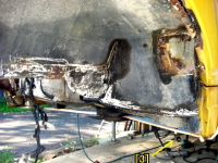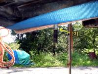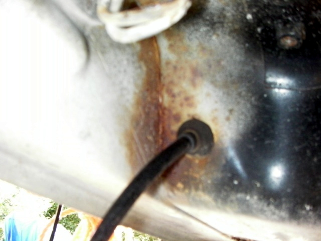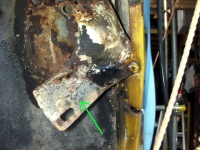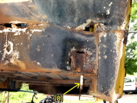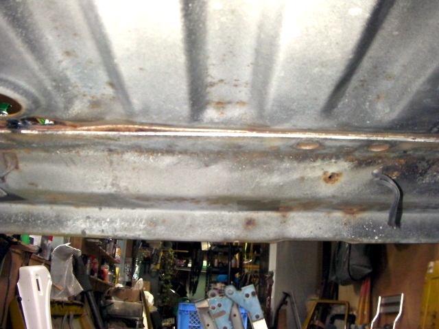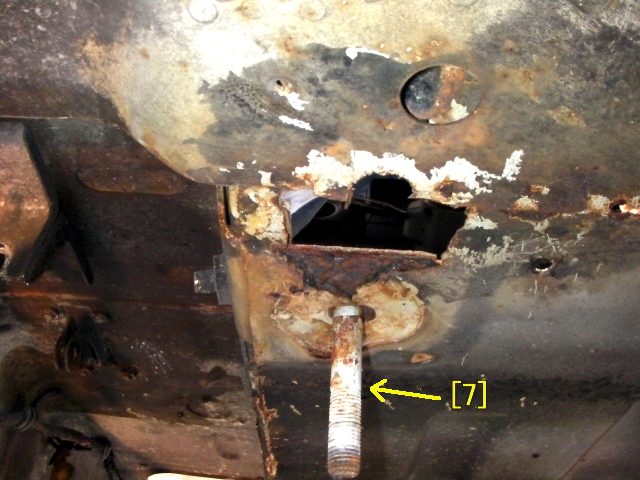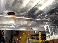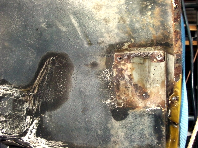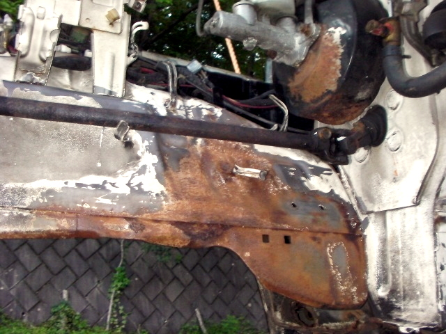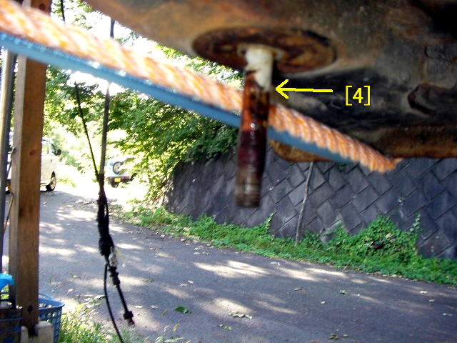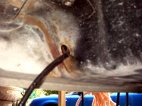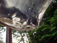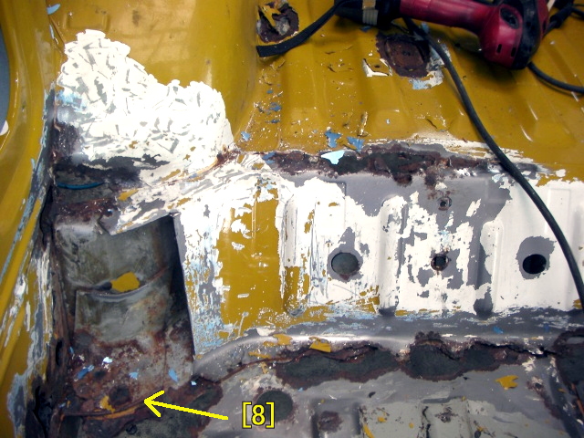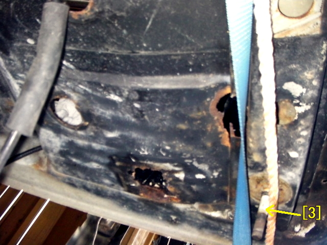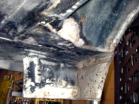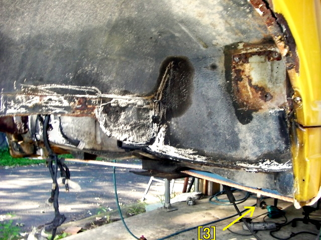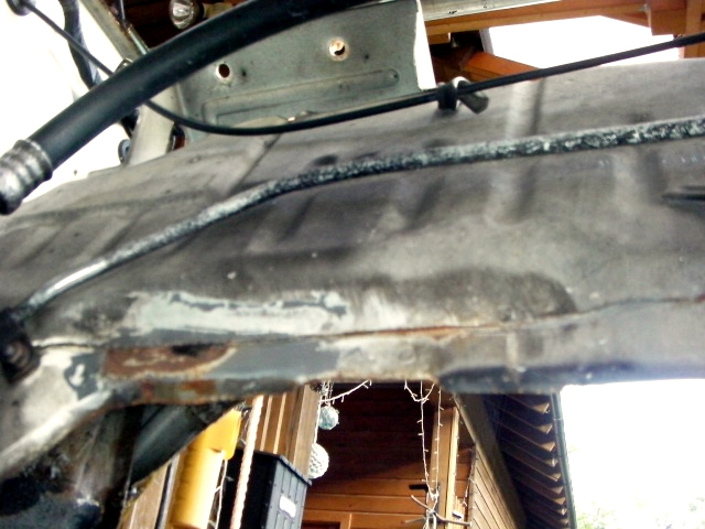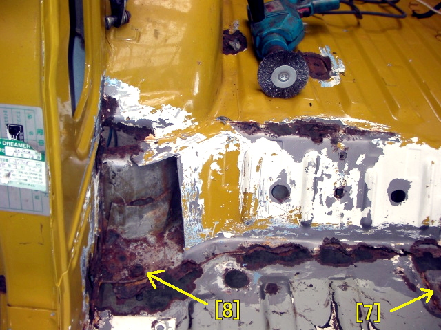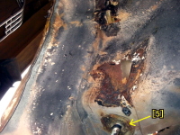 | 運転席後方(ボディマウント[8]あたり)の錆と塗膜をドリルに付けたワイヤブラシで落す |