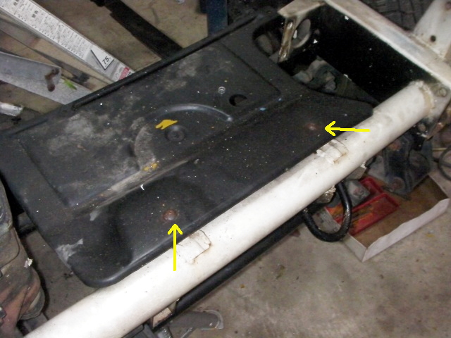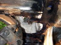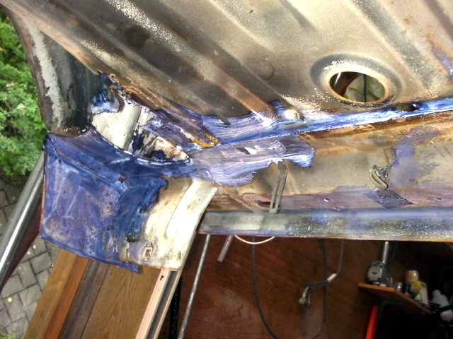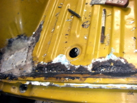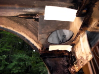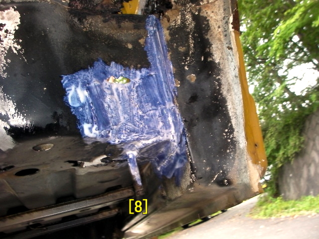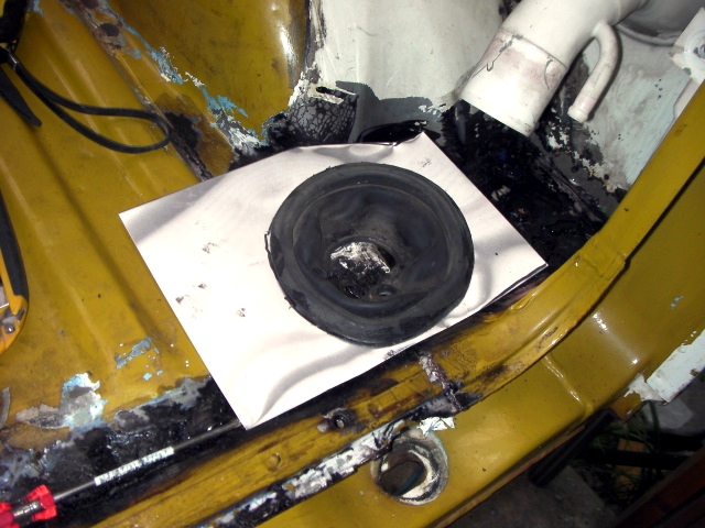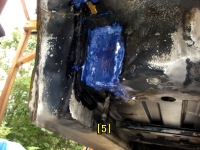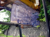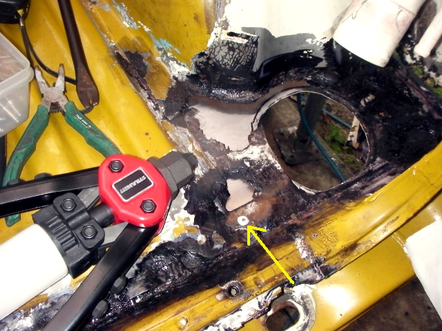 | 崩落した床の給油口ホースの穴の再建。下からアルミ板当てて、上からFRPを貼る。 |