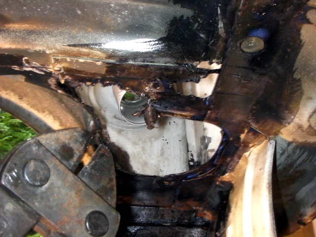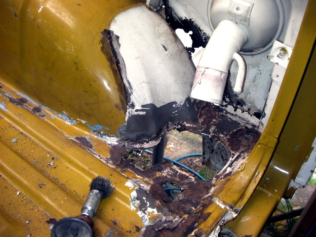 | 荷室後方の錆と塗膜をドリルに付けたワイヤブラシで落す |