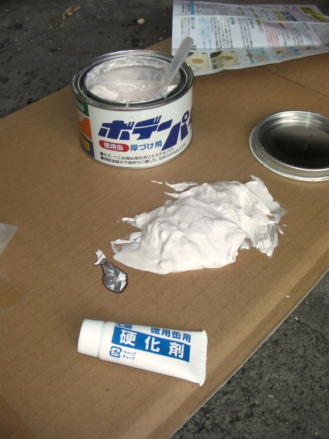 買ってあったんだけど、厚塗りは出来ないので、急遽ソフト99のボディパテを近所購入。 |