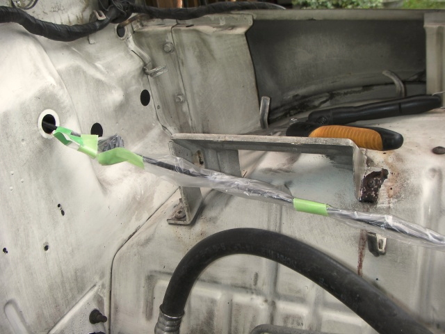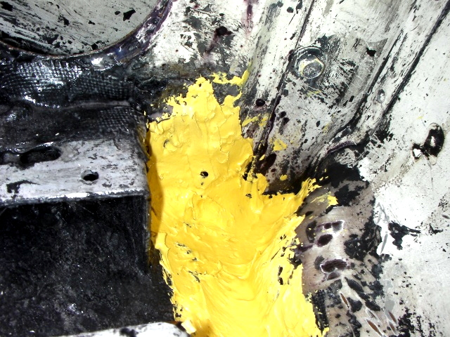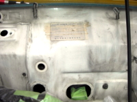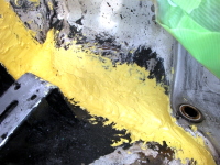 | そして、当初計画では、穴は下から厚めのアルミテープ貼って、上からFRP埋めですまして、下側を厚いアンダーコート(NX43)で仕上げる予定だったんだけど、このアルミテープの粘着力が思ったより弱くて、アンダーコートごと剥がれるような気がしてきたので、アルミテープは全部剥がして、ロックの「