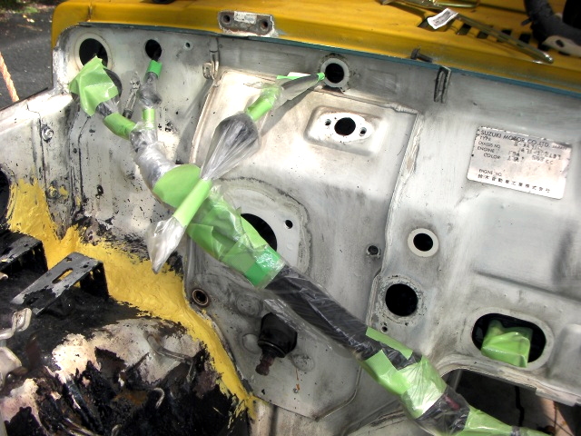 パテの乾燥待ちの間、マスキングを進める。当初、外すのメンドで残してボンネットキャッチやプラパーツ、ステアリングシャフトもマスキングする方がメンドなんで、やっぱり外す |