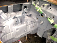 当初計画では錆々だったブレーキマスターシリンダーの下あたりだけ吹く予定だったけど、塗装や汚れの剥ぎ落としも結構あって表面が荒れてるので、エンジンルーム内は全部吹く。ボディ下は、基本的に厚塗りアンダーコート(NX43)だけしか吹かないので、プライマー(ミッチャクロン)のみ |