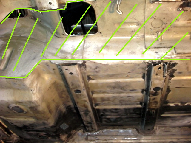 ミッショントンネル(斜線部)は、エンジンルームと同色で塗り、他は厚塗りアンダーコート(NX43)を塗る |