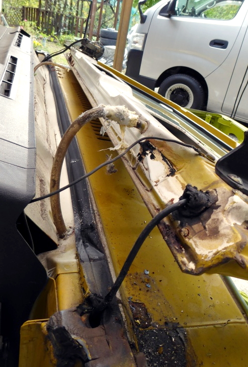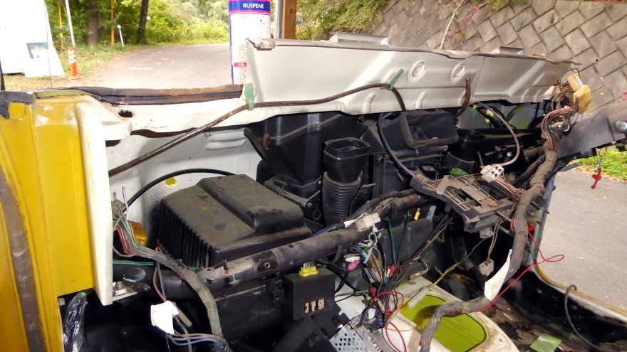 フロントウィンドー、ピラー、ダッシュボードを外す。