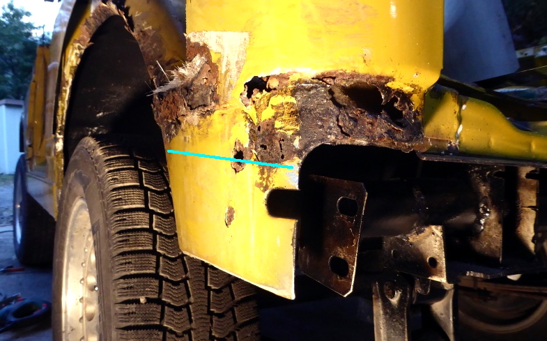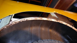 【16:45】ジグゾーで切れないトコはグラインダー使って、フェンダー外板の大錆部分を切除 |