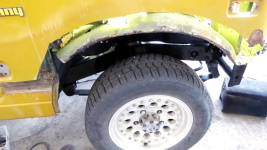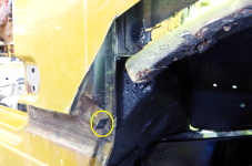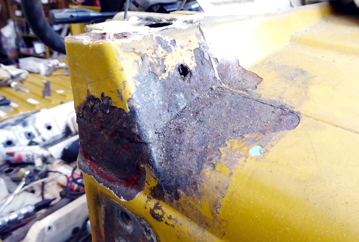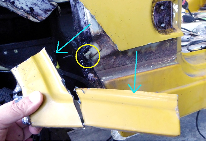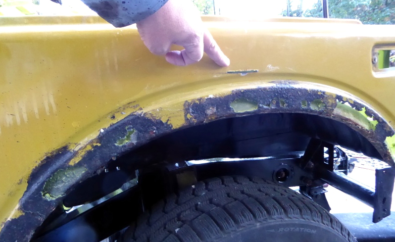 左フェンダー下部も切除した。こっちもそこそこ逝ってる。 丸印の折れたボルトは後で抜く |