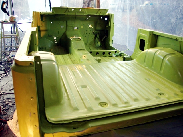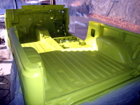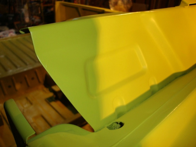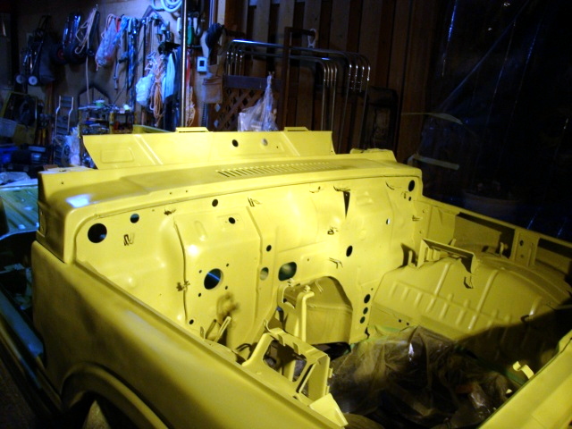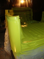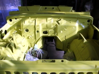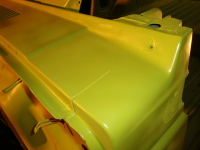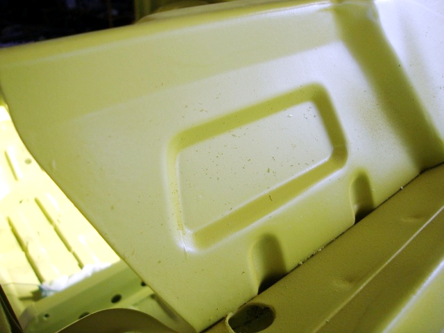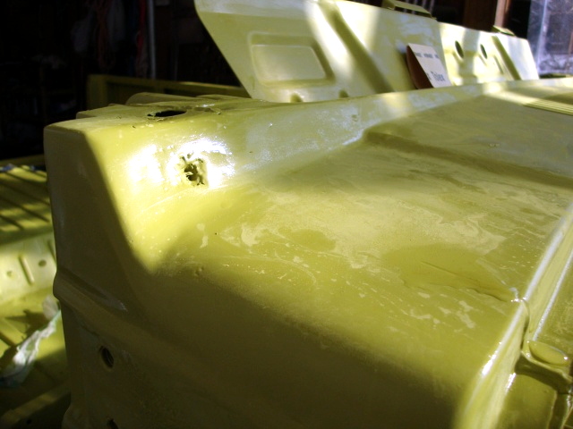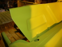【12:53】ゴミ取り研磨だけやって、クリヤ吹くつもりだったんだけど、最初の方に塗ったのが、希釈が濃すぎて、ダマが飛んでたり、塗り肌が粗かったり、ちょっと暗かったので、塗りが薄いトコもあって、#600で全面水研ぎした。(室内以外)