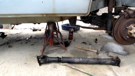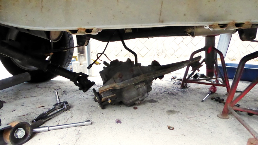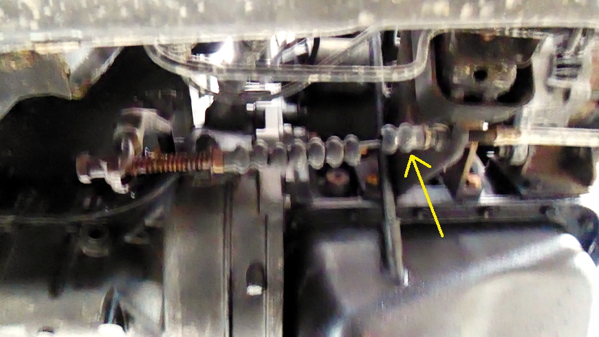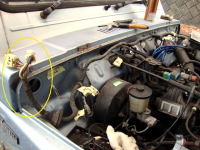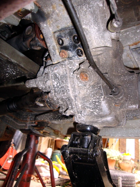 | トランスファー前側のドライブシャフト上部のボルトは室内から外す。 |