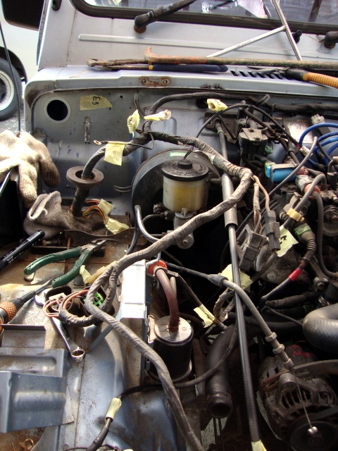 4/9(日) 本日は、メインハーネス外して、ラジエター廻り・トランスファー外して、エンジンを降ろす準備。