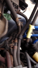 点火コイルの下側の固定ボルトに、メインハーネスの