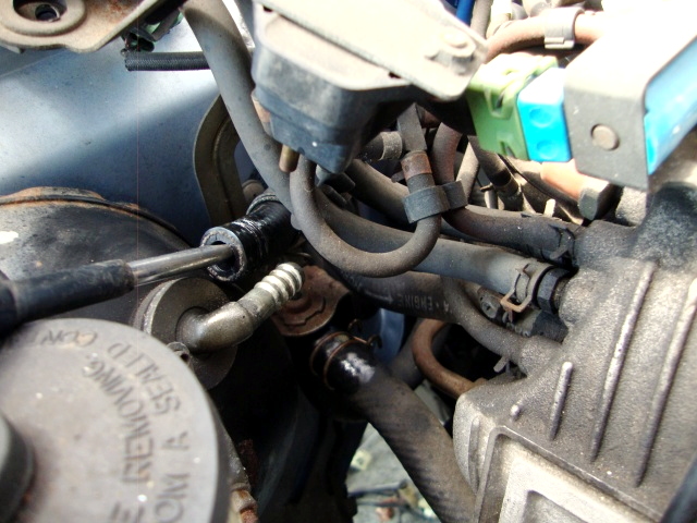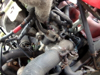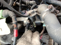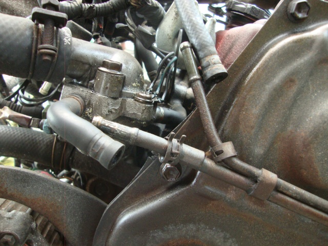 | 次は、エンジンルーム内の残りの配管の取り外し。ヒーターホースは再利用しないので切断。 |