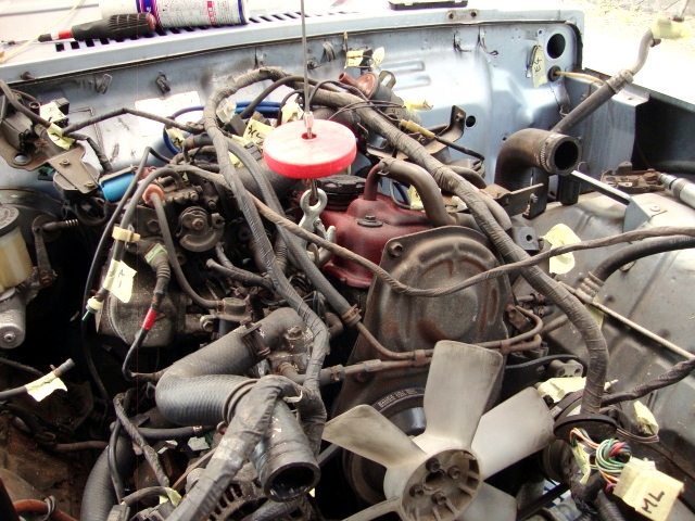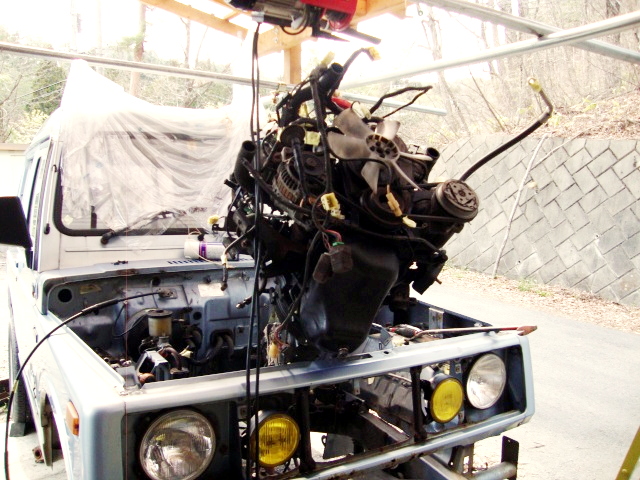 4/16(日) 本日は、車体後部のメインハーネス外して、エンジンを降ろし、タイミングベルト等の交換準備。