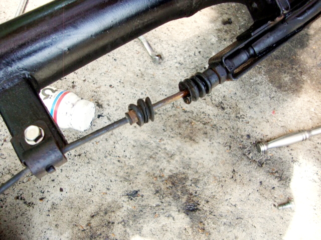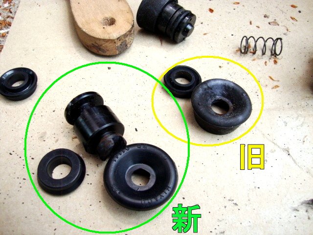 | では、リヤブレーキのOHに着手。OHキット購入済なんで、ゴムパーツは全交換。まずは右側から。 |
