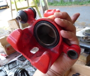 | 塗装が終わった左のブレーキキャリパーのマスキングテープと保護に入れておいた古いシールを外す。 |
