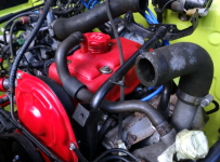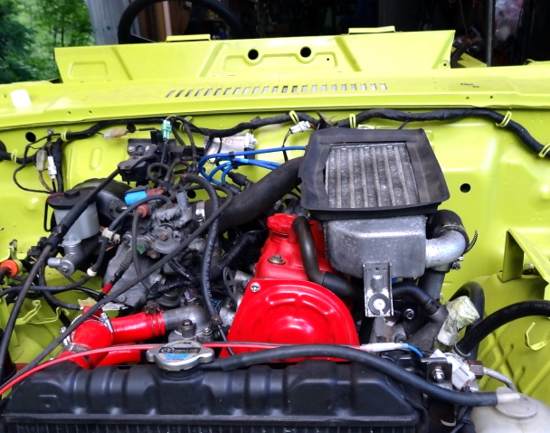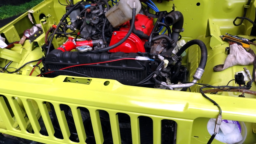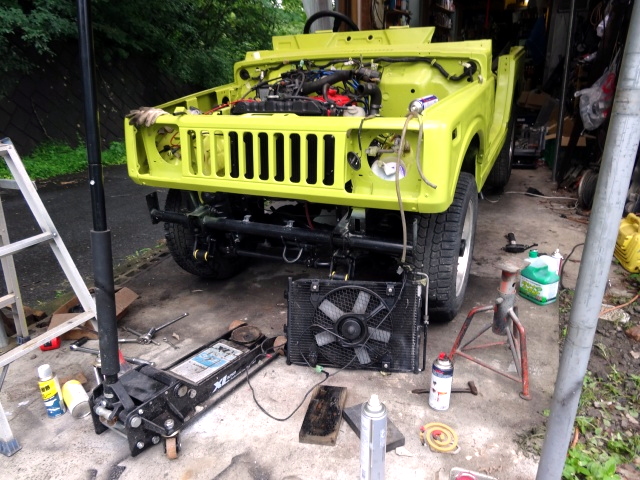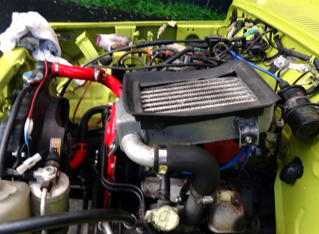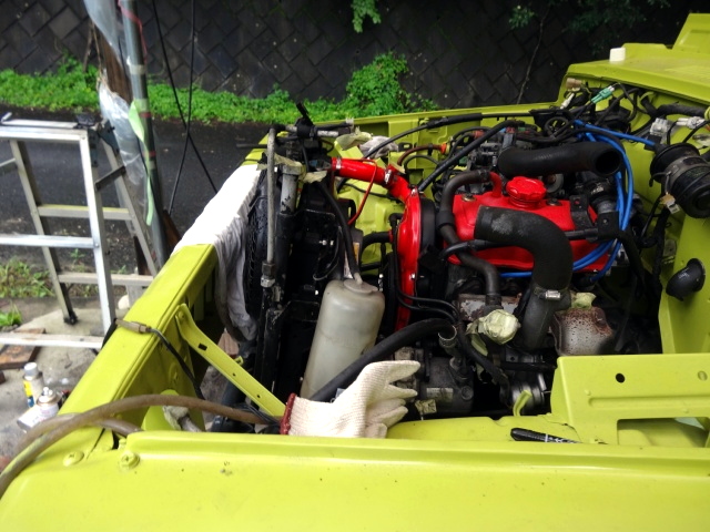本日は、エアコンのコンデンサー・エンジンルーム内の残りの配線・配管・インタークーラー・エアクリーナーボックス等の取り付け。 |