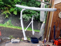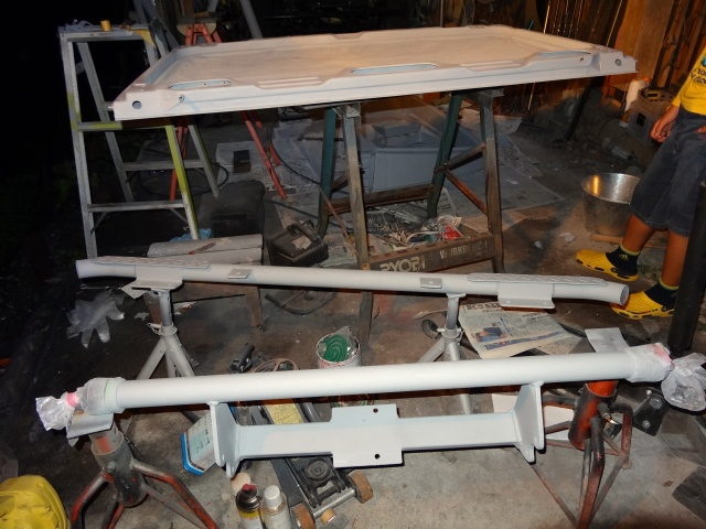 | ロールバーが塗りにくいので、上から針金で吊ったら、モビール状態(笑) |