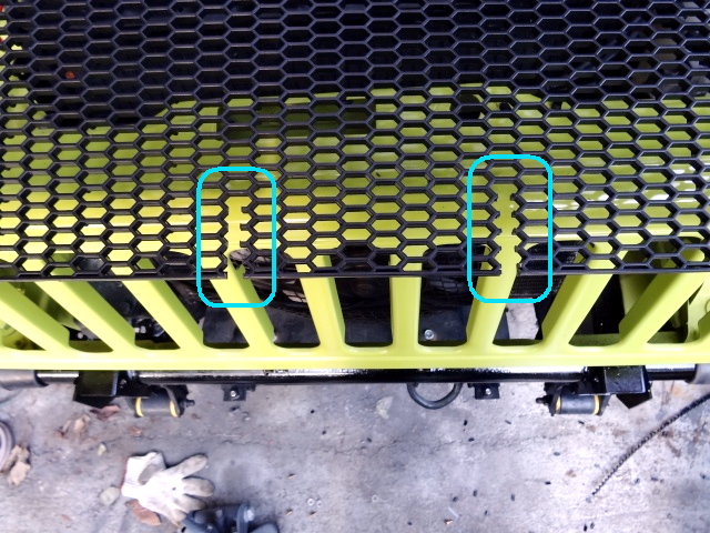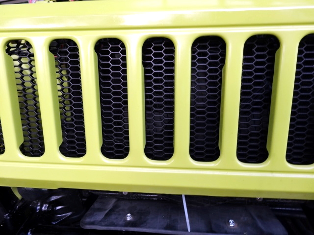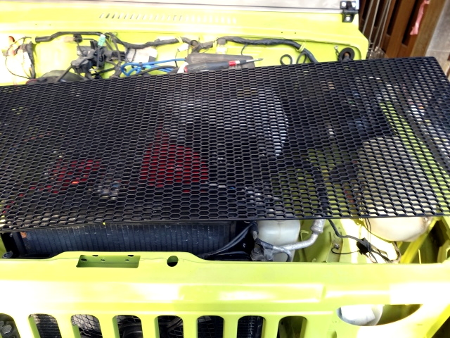 破れてる純正のグリルメッシュの替わりのABS樹脂のハニカムメッシュグリルネットをカットして付ける。 |