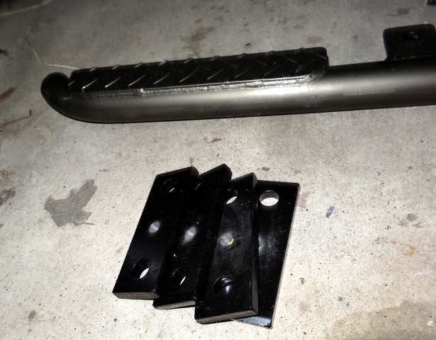 このステーが結構ごついので、切断して、別の穴を開けるのは難儀しそうなので、厚め適当な部材を色々調べた結果、シャーシUボルト座金を4つ購入。