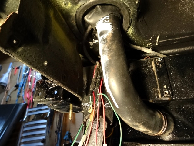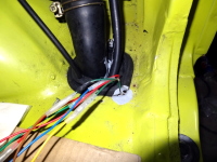 どこを通すか悩んだ結果、燃料ホースのブーツの切れ目を床下から通す事にした。
