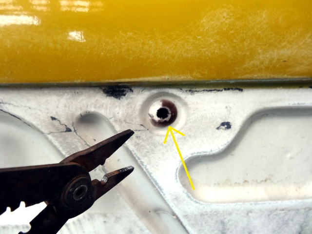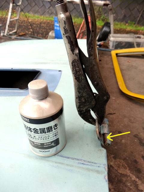 まずは、固着してるボンネットヒンジを動かすために金属磨きを隙間に垂らして、バイスグリップでぐりぐりする。