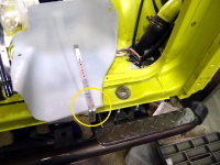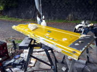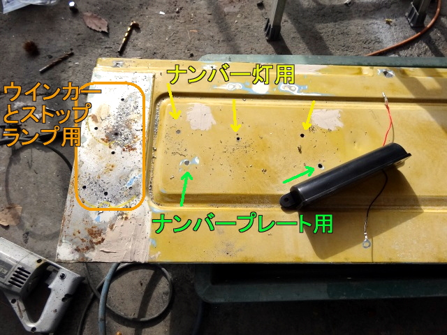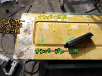 リヤゲートへの配線を検討し、配線用の穴位置決め、燃料ホースカバーのステーも位置合わせ。 |