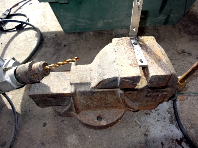スペアタイヤのステー用に買った厚ステンのL字。凄く硬くて、ハンドドリルで1つ穴開けたら疲れたので、後は後日。