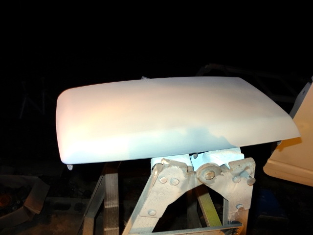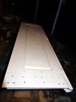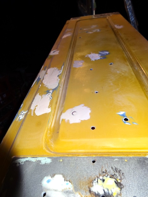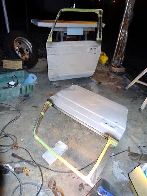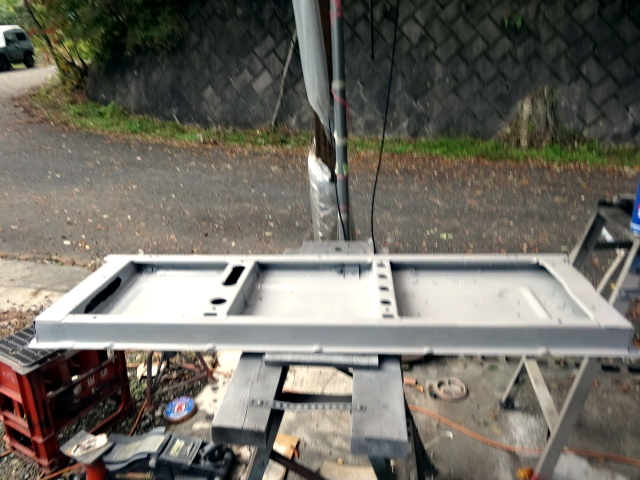 | ドア上部のガンメタに塗ったトコをマスキングし、下部の下処理、プラサフ塗装。 |