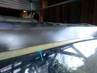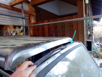結局純正ゴムが前方の収まりが良い感じだが、上部に隙間が出来る。強雨だと抜けてきそうなので純正ゴムの上にスポンジゴムを貼る事にする。 |