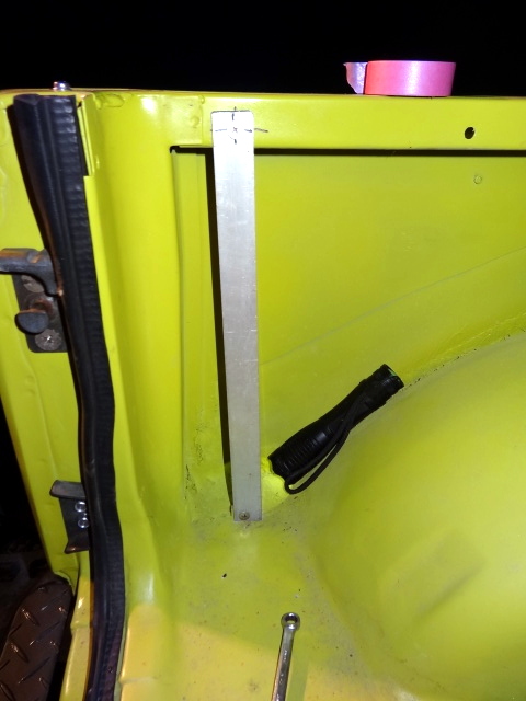 リヤゲート内側のステーは、コの字のアルミ材でステーを作ったけど、加工しにくいし、それほど強度もいらなそうなので、L字のアルミ材を使う事にする。 |