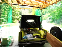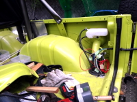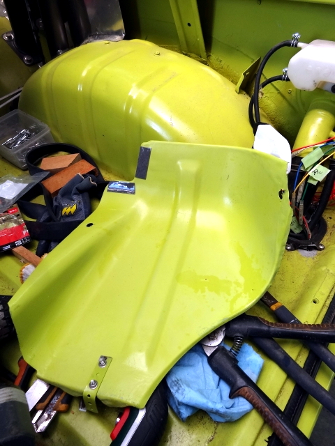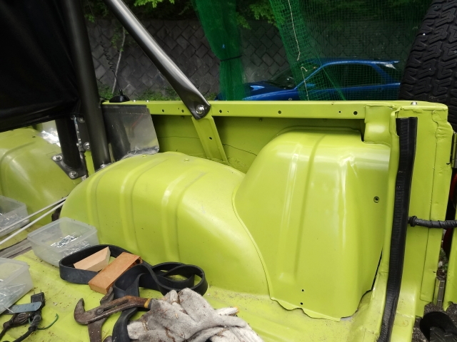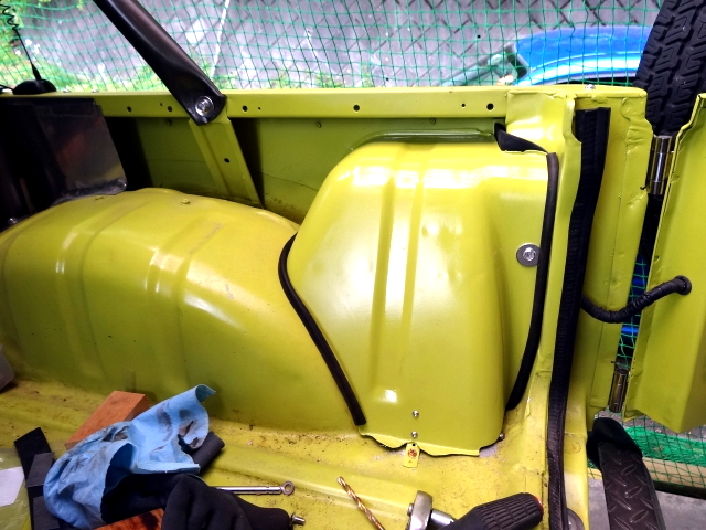 荷台右内側の板張りの前に、給油口裏のカバーの取付け。