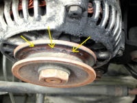 | 10/13(土) オルタネーターのプーリーの錆落とし。 9/1(土) にファンベルトを再調整したけど、電圧は、まだ低い状態の時がある。 なんかゴムの焦げ臭もあるので、ファンベルト廻りの再点検したら、再び、大量のゴムの削りカス。 よく見たら、プーリーに錆の凸凹があった このオルタネーターは、永年ガレージで眠っていたJA11エンジンの備品。 ジムニー再生でサイズアップしたんだけど、プーリーの錆までは確認してなかった。 って事で、プーリーの錆落しして、予備のファンベルトに交換する事にした。 |