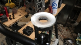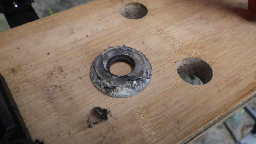 アダプターをもう少し大径にすべく色々探したら、古いジムニーのショックアブソーバー留めてた、皿型のワッシャーの平らな部分の内径が32mmで丁度のサイズだった。