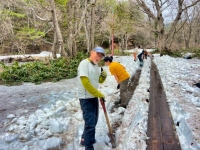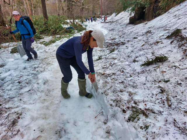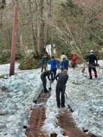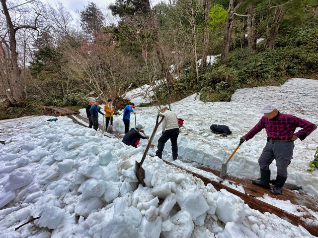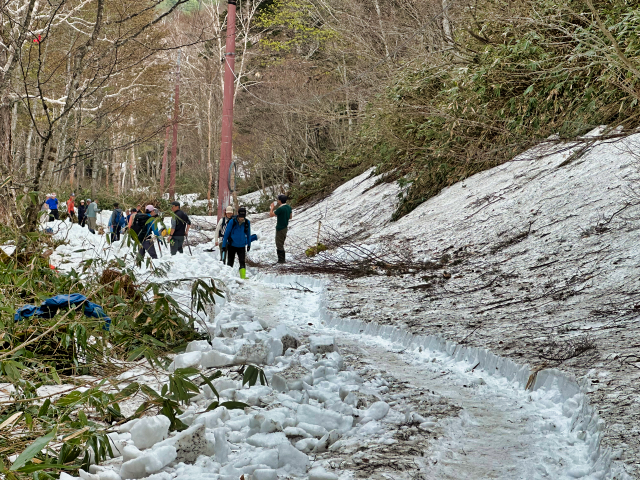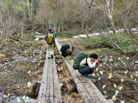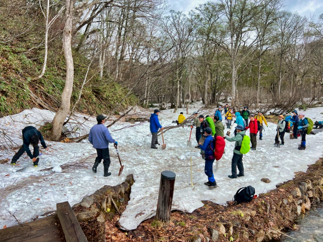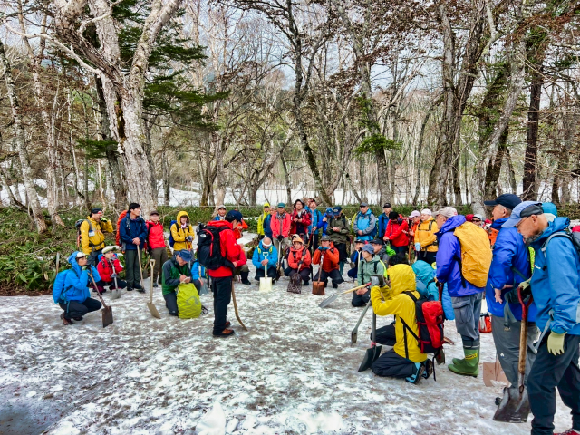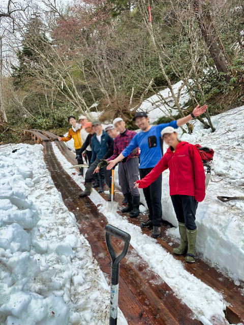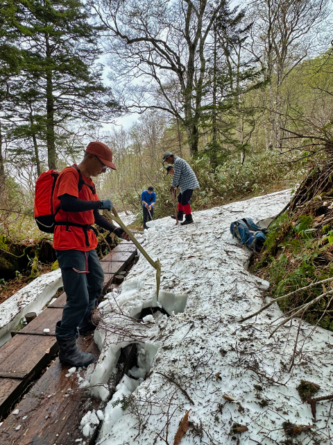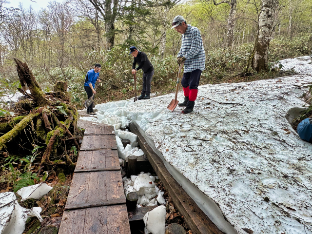 | 2025/5/22 ママは木道の除雪で尾瀬へ。 「今日は、尾瀬ガイド協会ガイド50数名で、木道の一斉除雪を行いました。 また、谷川岳山岳警備隊の方にも手伝って頂き、皆で膝上ほどある雪を切って掘って、木道を出しました。 木道の雪は、下部は氷となっていて、掘るのがかなり大変でしたが、一部の箇所を残して、安心して歩けるようになりました。 やっぱり、皆でやると早い!。 ガイドの皆様、大変お疲れ様でした。どうぞ腰を労わって下さい(笑)」 |
