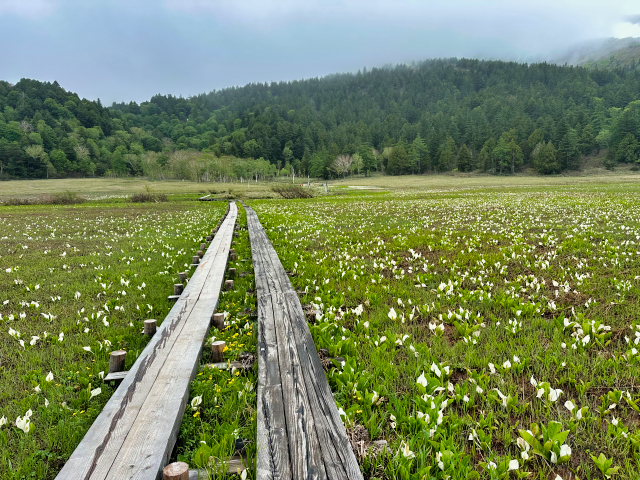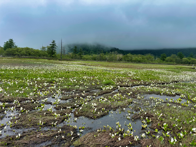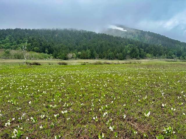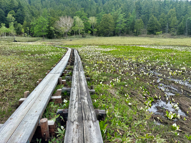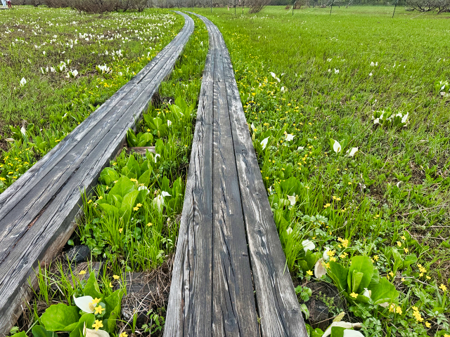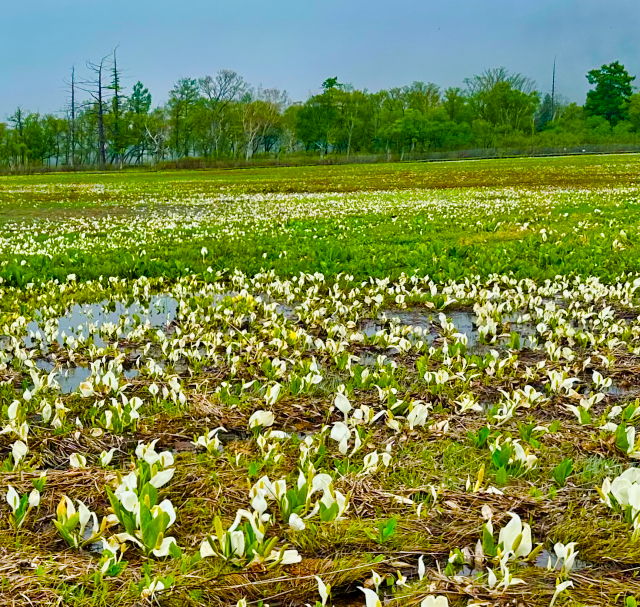 縦走ツアーでは立ち寄れなかった、念願の研究見本園 水芭蕉群落を堪能。まだまだ見頃?」
