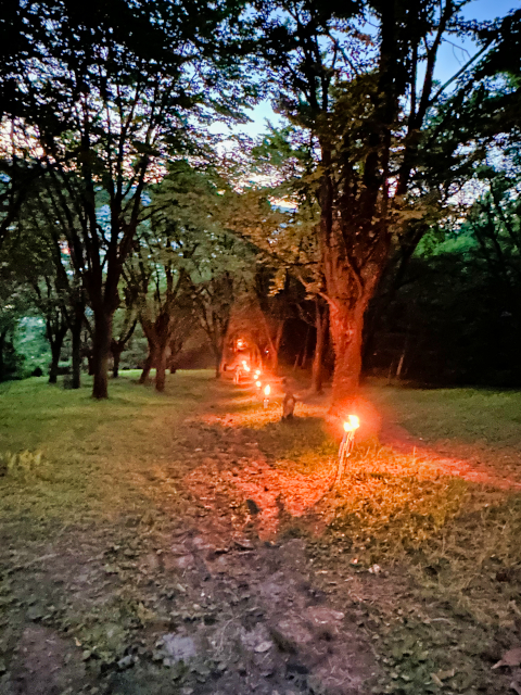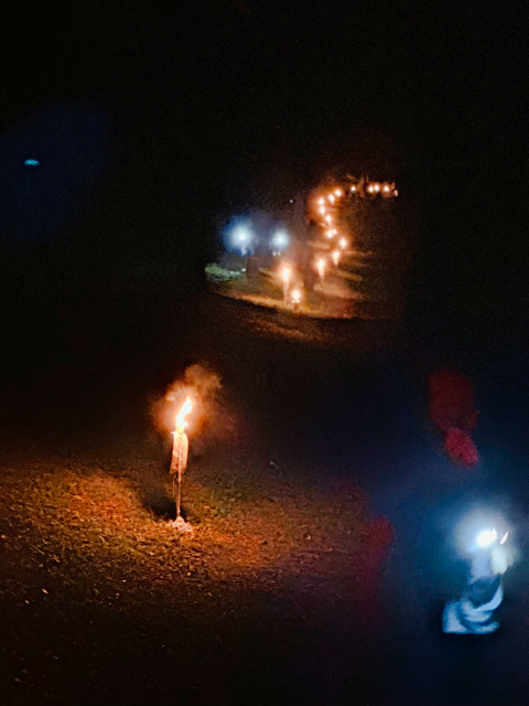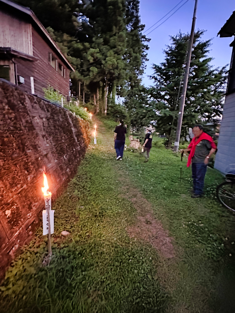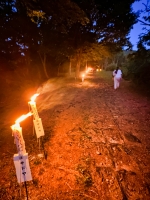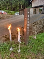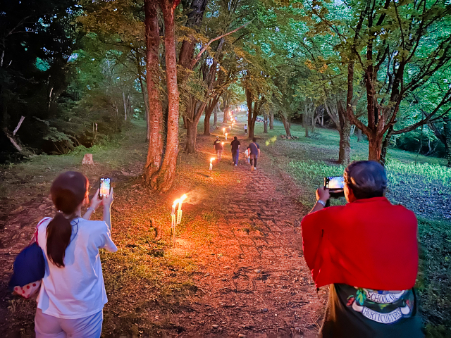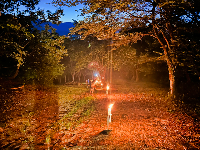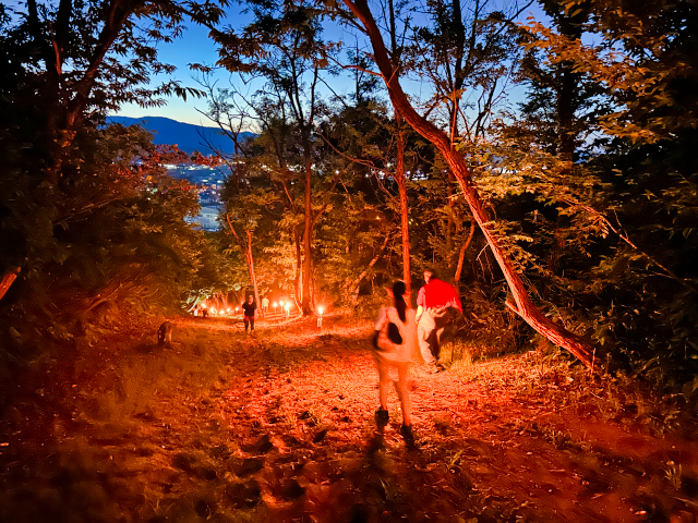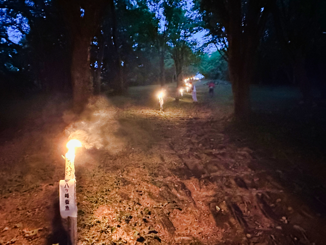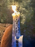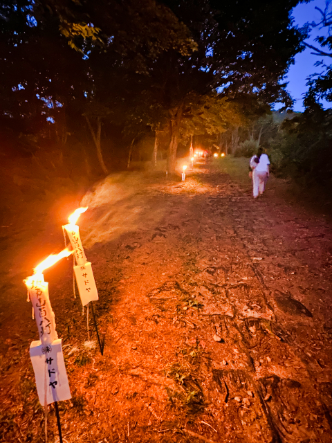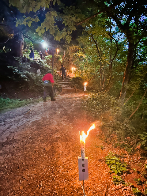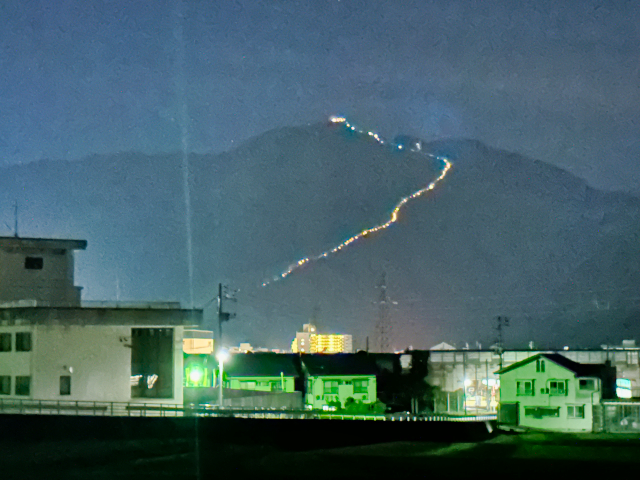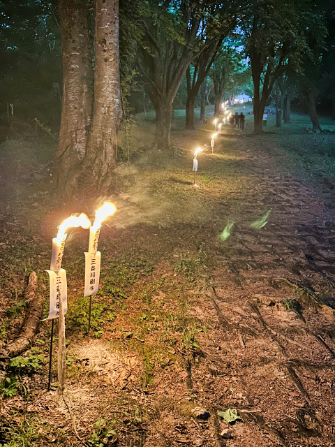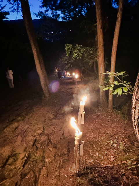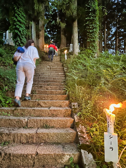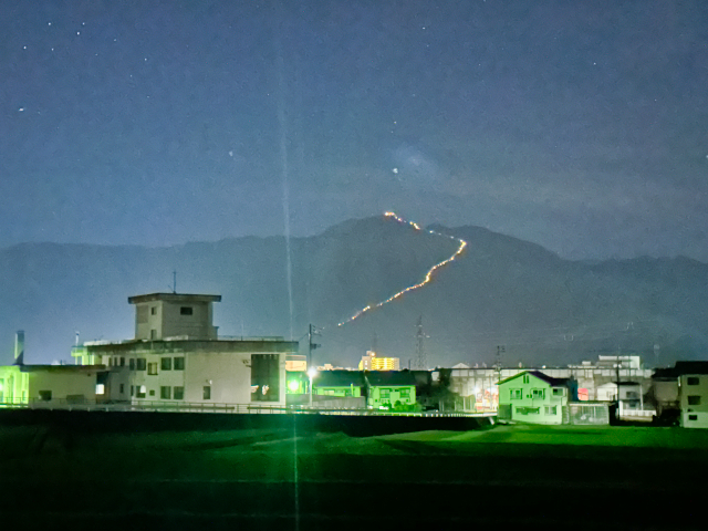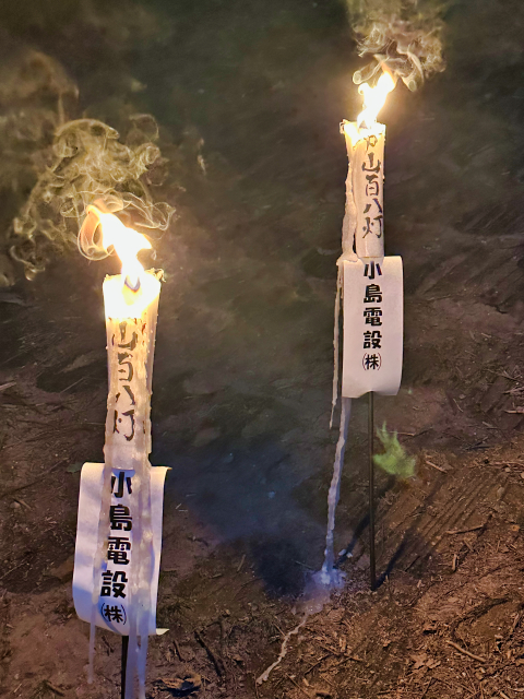 登山道を200本以上のロウソクの灯りで照らし、無病息災や五穀豊穣を願う400年以上続く伝統行事で、