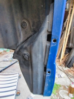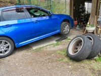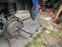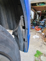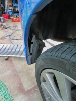調べると、リヤをぶつけた衝撃で、ホイールハウス内の泥除け兼用の?パーツが左右共外れかかってる。
