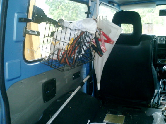 左リヤサイド窓のステーに、小物入れ(自転車のカゴ)を付けた(^^) |