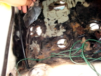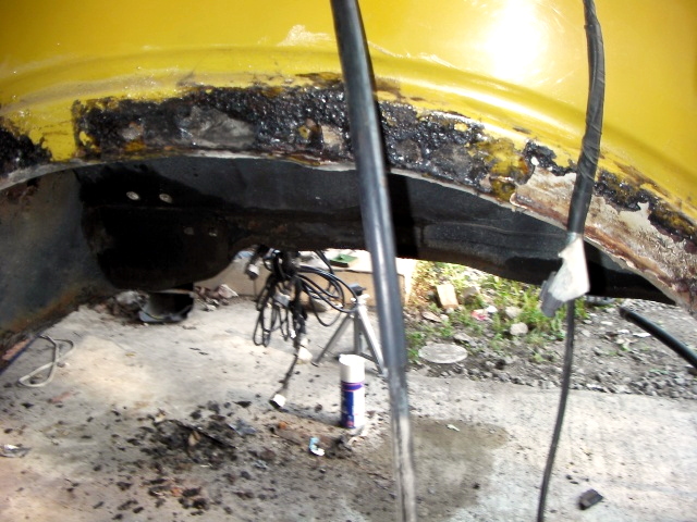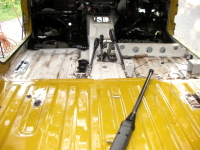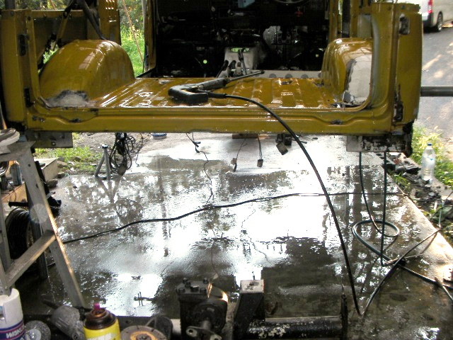 運転席・助手席あたりの室内とフレームの傷んでるトコの浮き錆除去して、塗料の剥離剤塗って高圧洗浄。 |