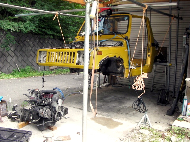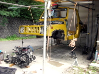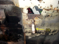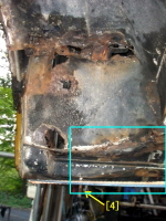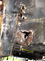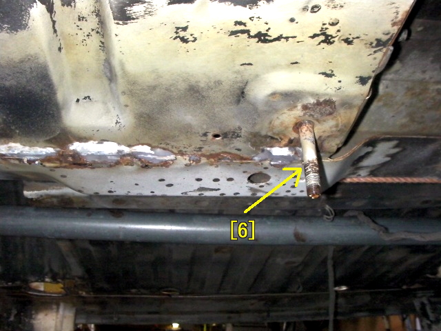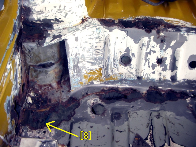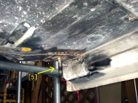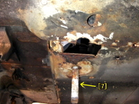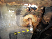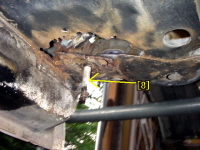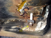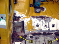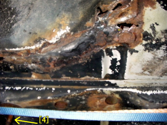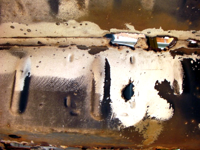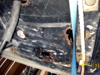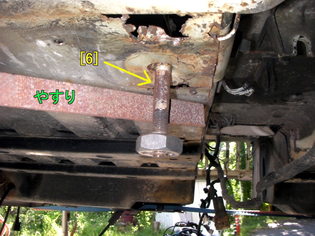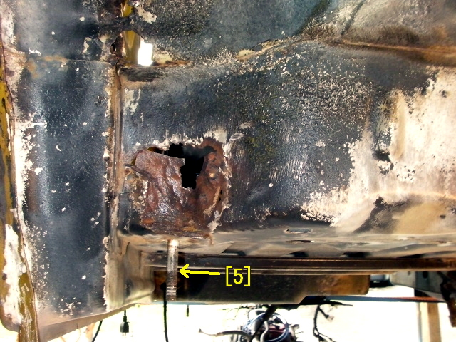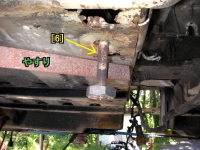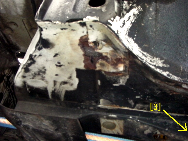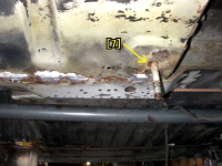 | 運転席後方(ボディマウント[8]あたり)の錆と塗膜をドリルに付けたワイヤブラシで落す |