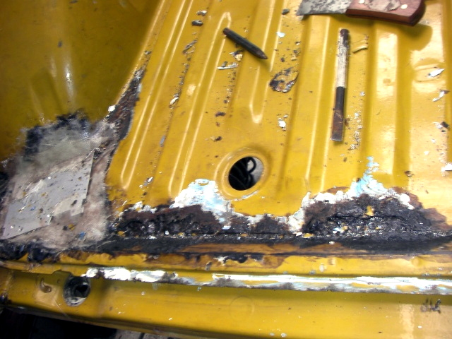 | 荷室後方の錆と塗膜をドリルに付けたワイヤブラシで落す |
