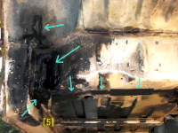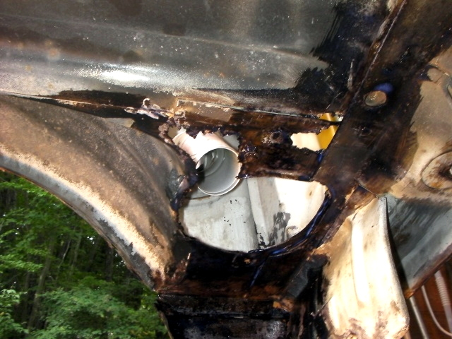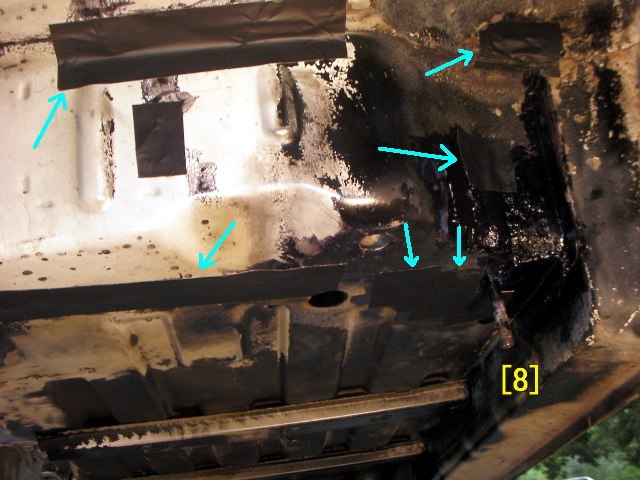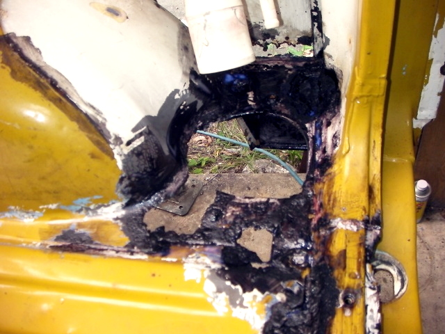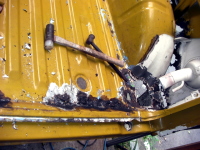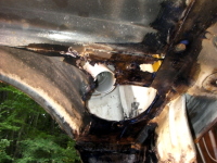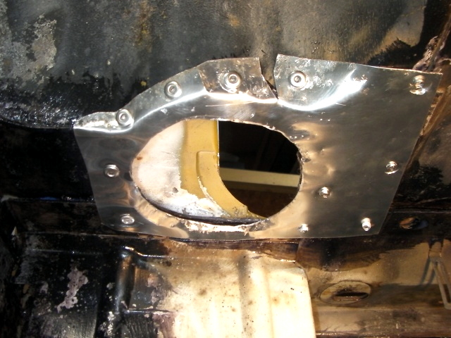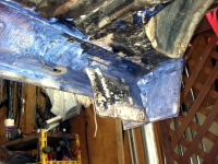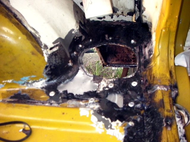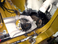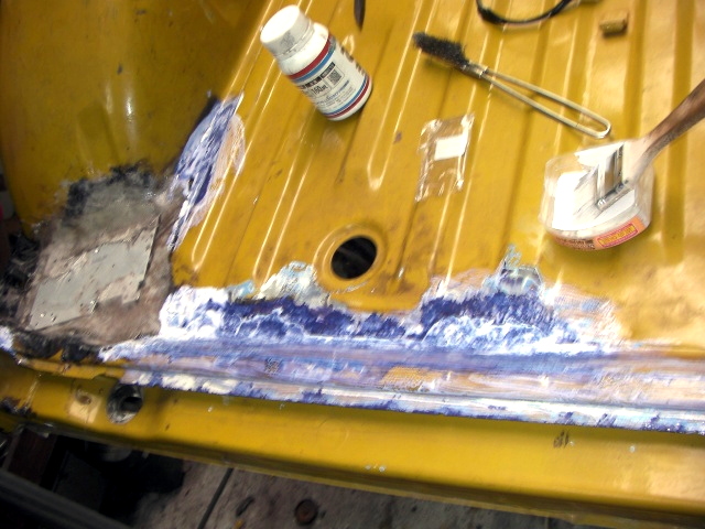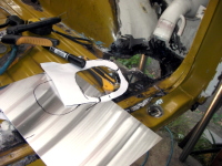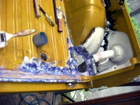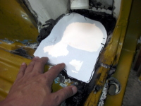 | 崩落した床の給油口ホースの穴の再建。下からアルミ板当てて、上からFRPを貼る。 |