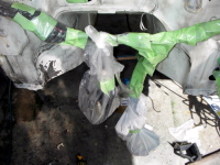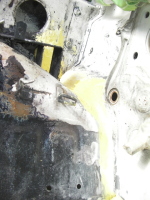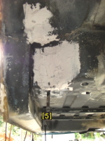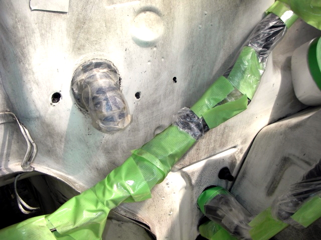 | そして、当初計画では、穴は下から厚めのアルミテープ貼って、上からFRP埋めですまして、下側を厚いアンダーコート(NX43)で仕上げる予定だったんだけど、このアルミテープの粘着力が思ったより弱くて、アンダーコートごと剥がれるような気がしてきたので、アルミテープは全部剥がして、ロックの「