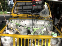 パテの乾燥待ちの間、マスキングを進める。当初、外すのメンドで残してボンネットキャッチやプラパーツ、ステアリングシャフトもマスキングする方がメンドなんで、やっぱり外す |