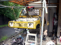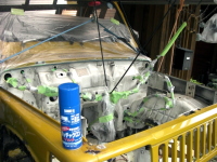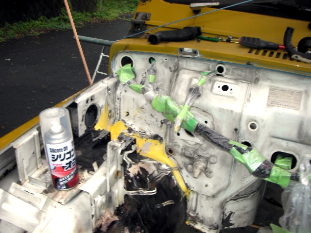 当初計画では錆々だったブレーキマスターシリンダーの下あたりだけ吹く予定だったけど、塗装や汚れの剥ぎ落としも結構あって表面が荒れてるので、エンジンルーム内は全部吹く。ボディ下は、基本的に厚塗りアンダーコート(NX43)だけしか吹かないので、プライマー(ミッチャクロン)のみ |