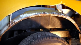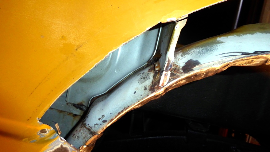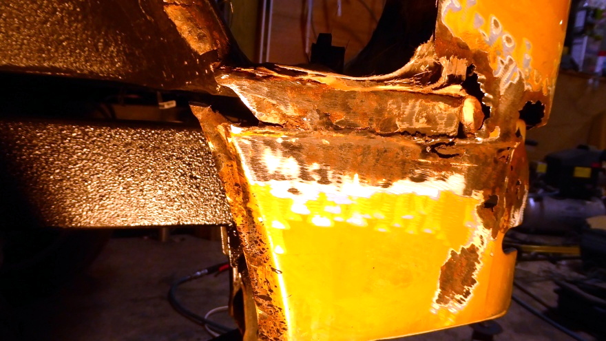 【16:45】ジグゾーで切れないトコはグラインダー使って、フェンダー外板の大錆部分を切除 |