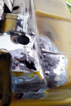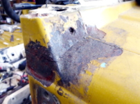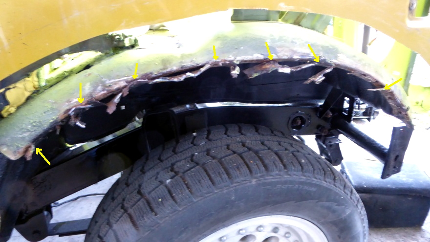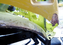 左フェンダー下部も切除した。こっちもそこそこ逝ってる。 丸印の折れたボルトは後で抜く |