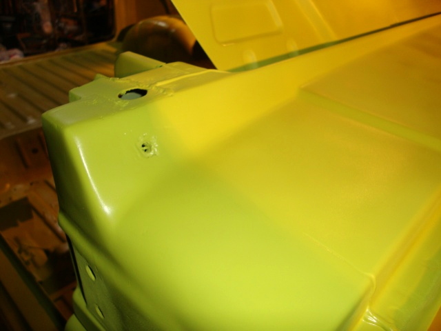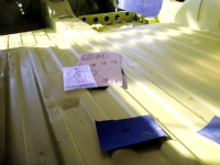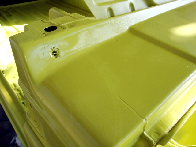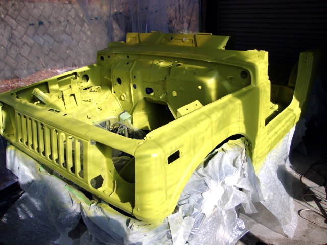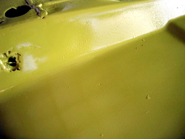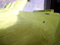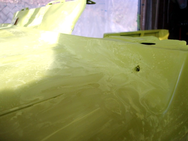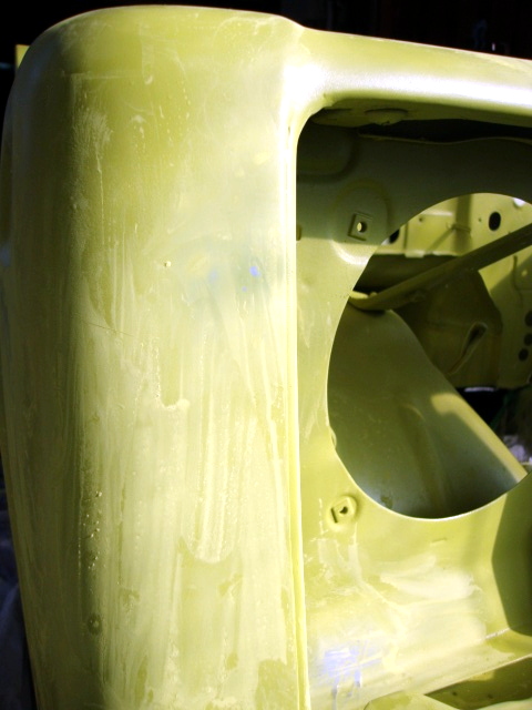 【12:53】ゴミ取り研磨だけやって、クリヤ吹くつもりだったんだけど、最初の方に塗ったのが、希釈が濃すぎて、ダマが飛んでたり、塗り肌が粗かったり、ちょっと暗かったので、塗りが薄いトコもあって、#600で全面水研ぎした。(室内以外)